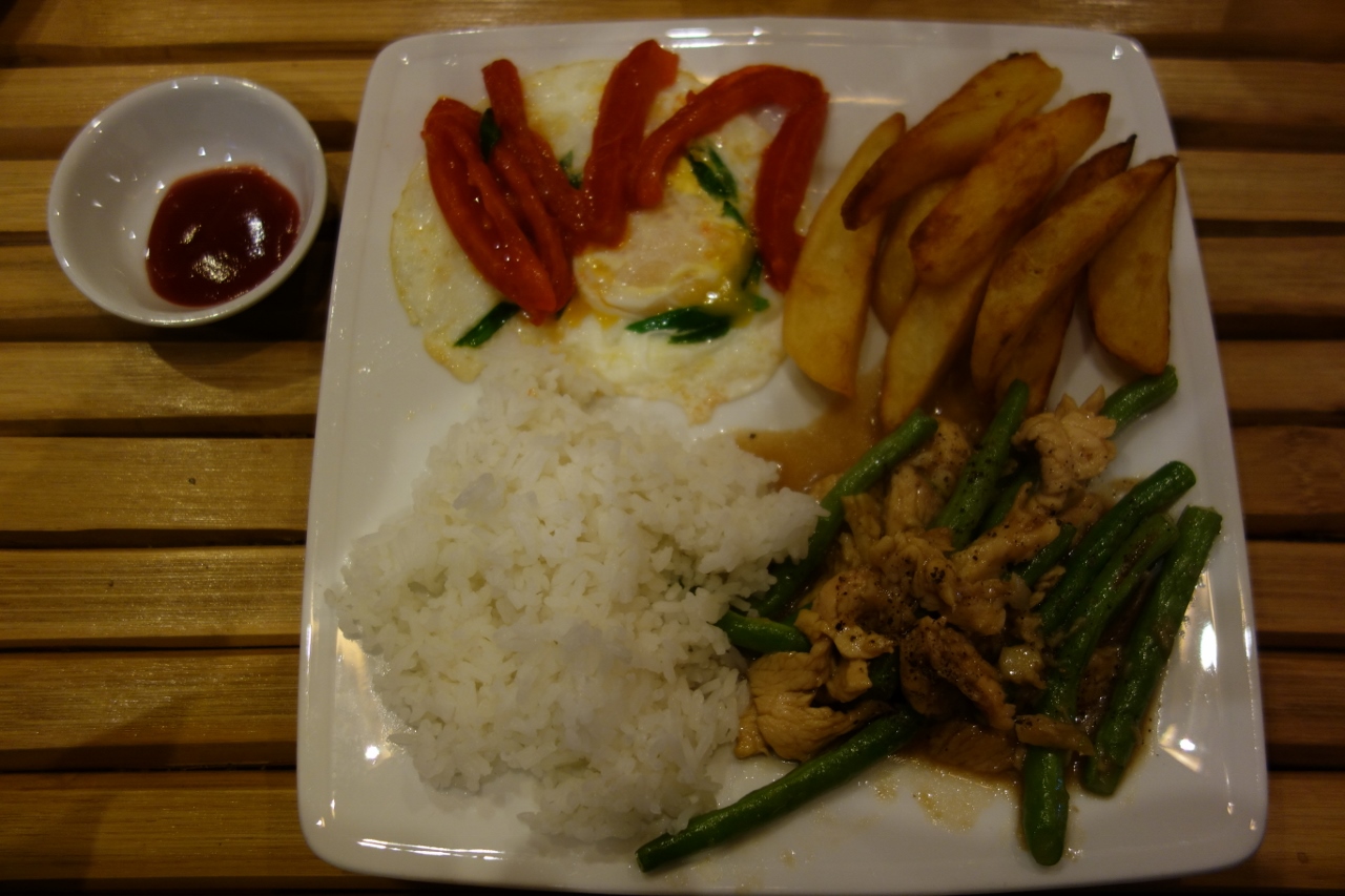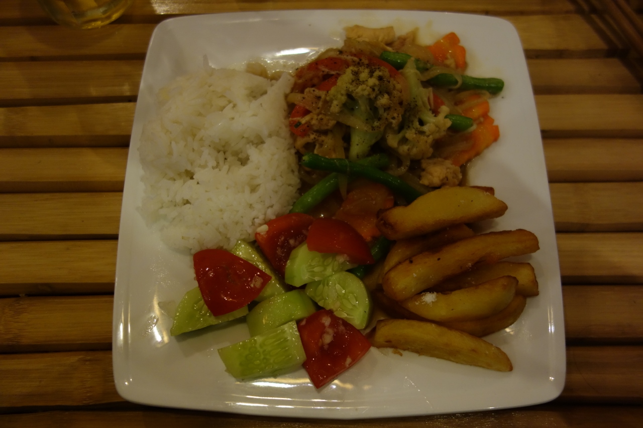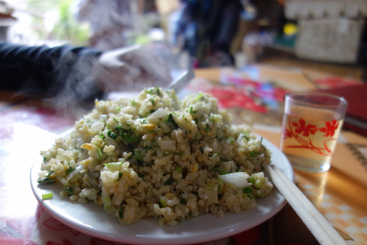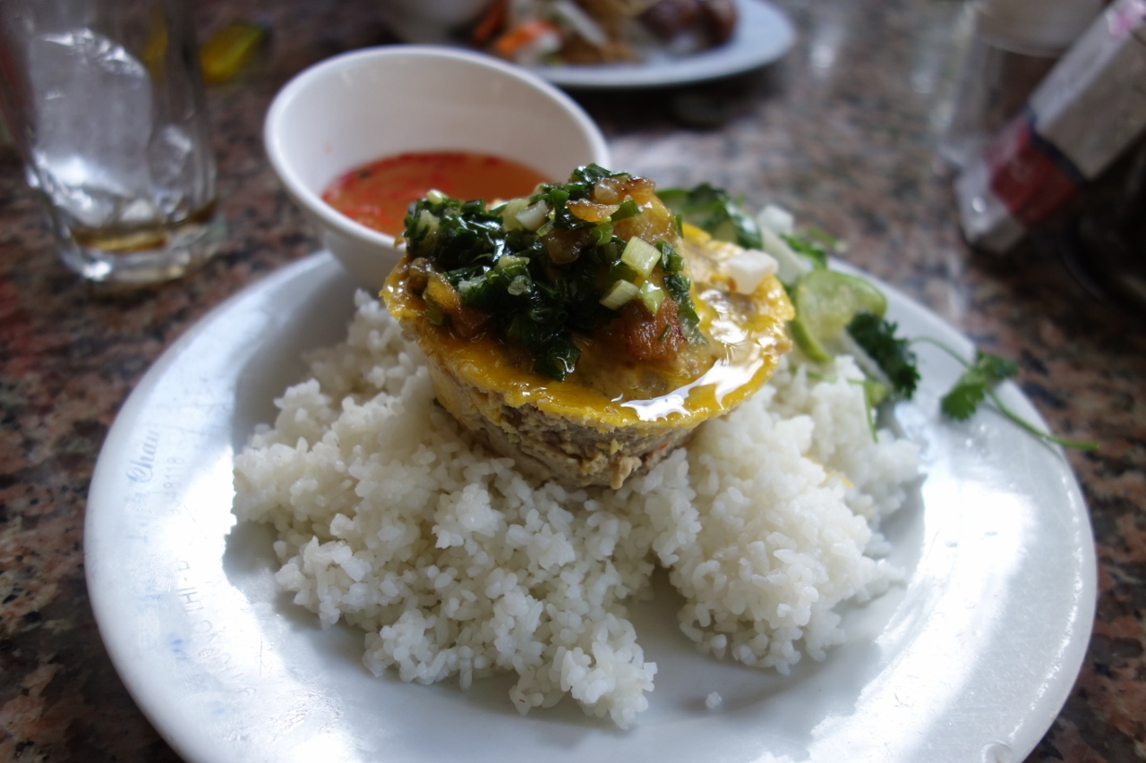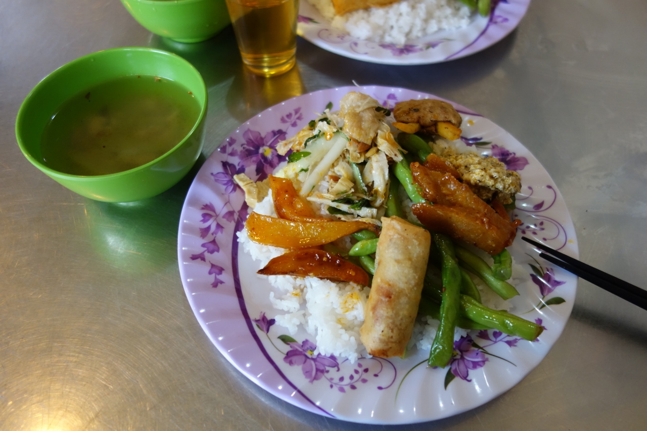 Riz, oeufs, légumes et paté, et même soupe de riz