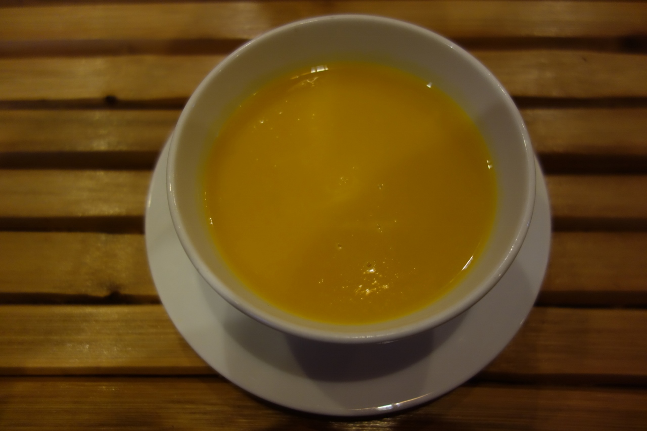 Petit plaisir de resto, soupe de potiron, dessert fruité et assiette complète